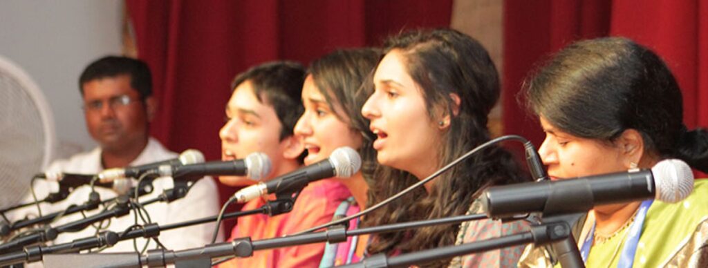 Bhajans (devotional songs) are an important part of our Satsang. These Bhajans are led by a professional teacher and talented singers among the members and sung in unison by the congregation. Bhajans remind us that while many paths lead to attain the bliss of God there may be none so enjoyable as singing His praise.