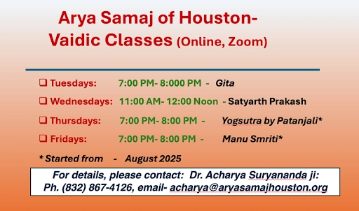Contact: Acharya Surya Nanda ji at (832)867-4126 or Kapil Mehta at 1+(713) 254-0106 or email to VaidicEdu@aryasamajhouston.org