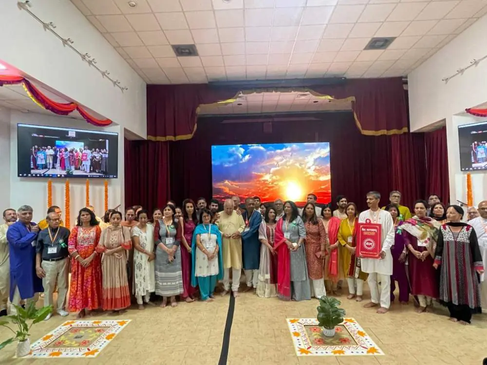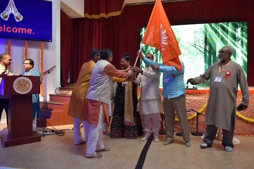 A striking feature was the passing of the OM flag to Arya Samajs in New York who will be hosting the 2024 International Arya MahaSammelan, similar to the passing of the baton in Olympic and other international games.