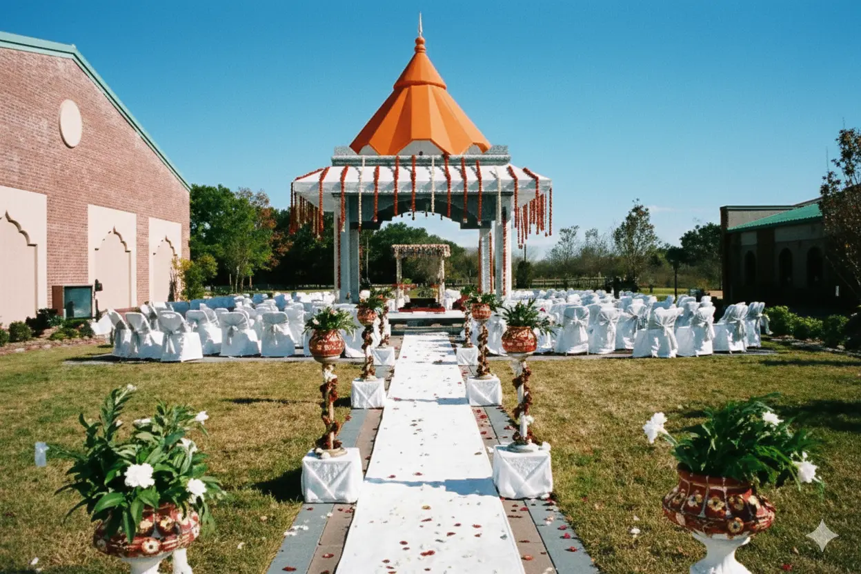 The Yagya-Vatika is a serene and peaceful oasis within the Arya Samaj Greater Houston temple complex. The landscaping and layout are conducive for the performance of havans and other auspicious ceremonies. The Yagya-Shala is an elevated 18’ by 18’ granite platform with a capacity of almost 50 people, surrounded by a pretty paved patio and green lawn, outlined with flowering plants and shrubs. The entire area can accommodate seating for up to 250 guests around the platform.